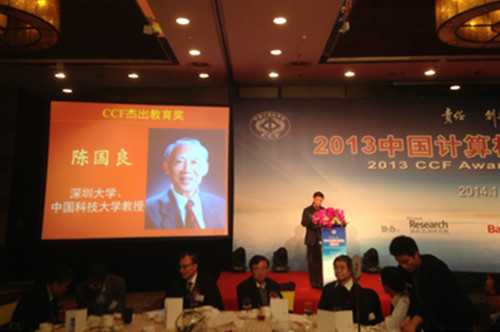 我校陈国良院士获得2013CCF杰出教育奖授予我校陈国良院士。颁奖仪式于2014年1月18日在北京金茂威斯汀大饭店举行。CCF杰出教育奖评奖分委员会主席李晓明主持,CCF副理事长吕建院士为获奖者颁奖。 CCF设立CCF杰出教育奖,奖励在计算机教育的教学、课程改革、教学方法、教育思想、研究生培养等方面做出突出贡献的教育工作者。 (计算机与软件...