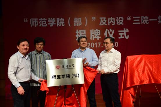 11月30日下午,我校在师范学院音乐厅举行了“师范学院(部)”及内设“三院一集团”揭牌仪式。校长李清泉,党政办、师范学院负责人及部分师生代表参加仪式。师范学院党委书记姚正武主持仪式。 我校师范学院此次院名扩展,是经过近一年的调研论证协调后,针对我校师范学院进行的学部制改革。同时针对师范学院原组织架构进行调整,成立了“三院一集团”,即教育学院、艺术学院、体育学院及附属教育集团。教育学院由教育系、教育技...