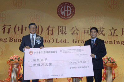 6月1日,永亨银行(中国)有限公司捐赠100万元在我校设立“乐竞平台永亨银行奖学金”,用于奖励我校品学兼优的本科生。 我校副校长邢锋出席了永亨银行(中国)有限公司的开业典礼。在奖学金捐赠交接仪式上,邢锋副校长代表我校从永亨银行董事长兼行政总裁冯钰斌手中接过捐赠支票并代表学校回赠了纪念品。 (学生处供稿)