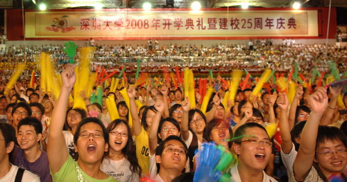 9月3日晚,田径运动场星光灿烂,欢声雷动,乐竞平台2008年开学典礼暨建校25周年庆典在这里隆重举行。深圳市领导李意珍、邱玫、闫小培、姜忠、陈观光,市政府秘书长李平;校领导江潭瑜、章必功、陶士平、陶一桃、阮双琛、邢锋、陈思平、李永华;一批活跃在各行各业的优秀校友代表;各学院负责人及教师代表;2008级全体新生和部分学生家长共8000多人出席盛典,共贺母校华诞,共享25年光荣与喜悦。 庆典...