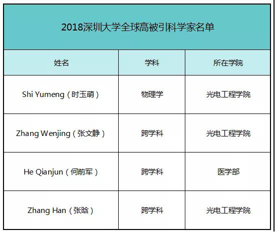 深大4位专家入选2018全球高被引科学家榜单,位列中国内地高校第25位