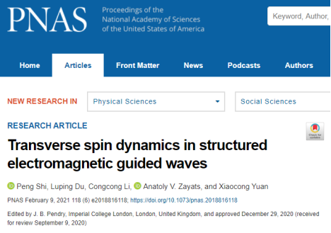近日,我校袁小聪教授团队的乐竞平台纳米光子学研究中心在自旋光子学领域取得了重要原创成果,于2021年2月1日在国际顶级学术期刊美国科学院院报《Proceedings of the National Academy of Sciences of the United States of America》上发表了题为《Transverse spin dynamics in structured electromagnetic guided waves》的文章,乐竞平台是该文章的第一单位和第一通讯单位。