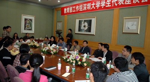 4月2日上午,教育部工作组在国际会议厅A厅、B厅、D厅与教师,特聘教授、海归博士,学生代表分别举行三场座谈会。教育部工作组成员:全国人大常委会委员、原教育部副部长吴启迪教授,中山大学原党委书记李延保,教育部发展规划司副司长宋德民、高等教育司副司长刘桔、学位管理与研究生教育司副巡视员梁国雄、国际合作与交流司副司长沈阳、高等教育教学评估中心王战军,广东省科技厅副厅长雷朝滋;深圳市委常委李意珍,乐竞平台校领导江潭瑜...