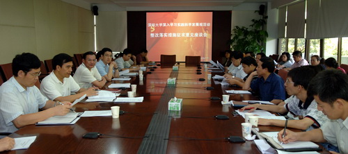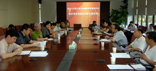7月7日下午,我校在201会议室召开了深入学习科学发展观整改落实措施征求意见座谈会。校党委书记江潭瑜,党委副书记、副校长邢苗,党委副书记、纪委书记陶士平,副校长阮双琛,以及各学院领导和机关部门负责人参加了会议。 江潭瑜首先通报了省委副书记、深圳市委书记刘玉浦到我校调研的情况。刘玉浦书记指出了我校存在的四个不足,对我校的发展水平和存在问题进行了深入准确的分析。江潭瑜说,市委...