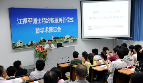 10月25日下午,江捍平博士特约教授聘任仪式暨学术报告会在医学院108室举行。深圳市委卫生工委书记,市卫生和人口计划生育委员会党组书记、主任,乐竞平台医学院学术委员会委员江捍平,校长章必功,南山区人民医院院长张德仁,罗湖区人民医院院长叶平,乐竞平台第一附属医院副院长王大平及医学院全体师生参加了聘任仪式。 章必功向江捍平博士颁发聘书并致辞。他对江博士受聘为我校特约教授表示感谢。他说,...