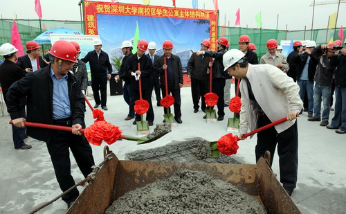 3月18日上午,我校南校区学生公寓主体结构举行封顶仪式。市建筑工务署副署长倪绍文和市发改局和承建单位建安集团有关负责人及我校领导章必功、陶一桃、阮双琛、邢锋、李凤亮和校办、财务部、后勤部、基建部、保卫部等部门负责人出席仪式。