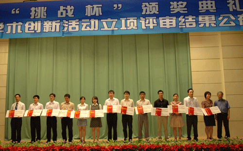 会上,章必功为2006年校级及第九届省级“挑战杯”获奖代表颁发了证书及奖金支票。邢锋为获得立项资助的项目颁发了资助支票。获奖学生代表林俊浩和指导老师代表刘志刚分别发了言。学生代表还向“挑战杯”获奖作品的指导老师献花致敬。