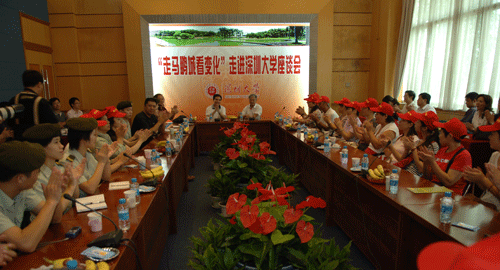 “观察发展中的变化,聆听变化中的故事”―昨天(9月16日)“市民巴士”驶进第13站乐竞平台,乐竞平台校长章必功、党委副书记陶士平率各学院、部门负责人早早就等候在校门前,热烈欢迎“走马鹏城看变化”参观团的到来。章必功深有感慨地说,“秋高气爽的季节,如此阵容的市民代表团走进校园、走近深大,这在我们建校24年历史上还是第一次。”