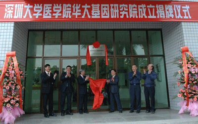 随后,全体与会人员在师范学院门口举行揭牌仪式,当牌子上的大红绸缎被章校长和汪院长共同揭开时,全场响起了热烈的掌声,医学院的成立标志我校步入了一个高水平综合性研究型大学,而与华大基因研究院的合作是我校医学院向国内一流国际知名的研究教学型医学院迈进的重要一步。