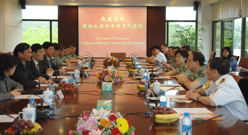 4月25日上午,国防大学外军学员考察团一行来我校进行参观交流。宾主双方首先在办公楼201会议室进行座谈,校党委书记江潭瑜、副校长阮双琛、外事处、科研处、校办等部门负责人出席了座谈会议。