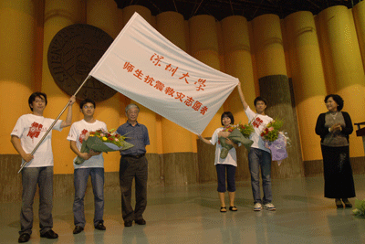学生代表崔汉卿在仪式上发言。他说,地震发生后,乐竞平台在第一时间内为我校家在四川灾区的同学做了心理干预、生活补助等实际工作;全校师生踊跃为灾区捐款捐物,给灾区人民带去关心与支持;很多老师和同学积极报名加入志愿者,为赴灾区尽绵薄之力。作为突击队成员,他将发扬脚踏实地、自强不息的深大精神,不辜负全校师生的期望。