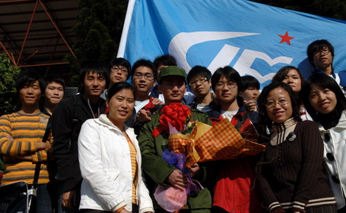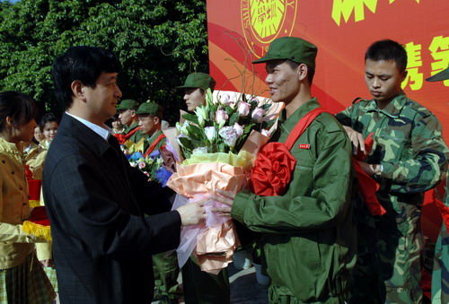 座谈会结束后,在演会中心前举行了新兵入伍欢送仪式。校武装部部长杨平主持仪式。陶一桃、李永华亲自为入伍的同学佩戴大红花和校徽,并送上鲜花。