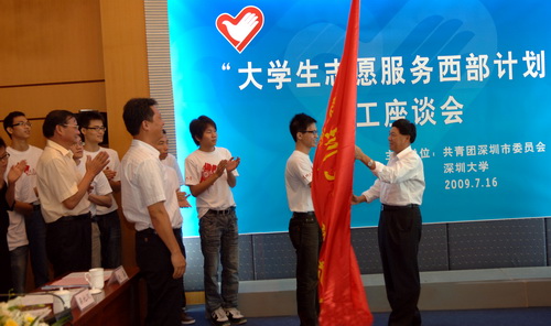 座谈会后,10名第二批西部志愿者庄严宣誓。李意珍为第二批志愿者授旗。