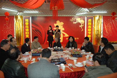 团年饭期间,留校师生歌舞庆春。一个热舞《叶子红》舞出了虎年红运当年;一首《快乐》唱出了同学们迎新年的好心情;新疆舞蹈、藏族歌曲清唱、藏族《锅庄舞》……师生们的热情一次次被点燃。来自新疆的维吾尔族、哈萨克族,来自西藏的藏族,来自贵州的布依族,来自辽宁的满族学生,还分别用自己的民族语言,道出对学校,对师生虎年好运的美好祝福,把团年饭师生同欢活动推向高潮。