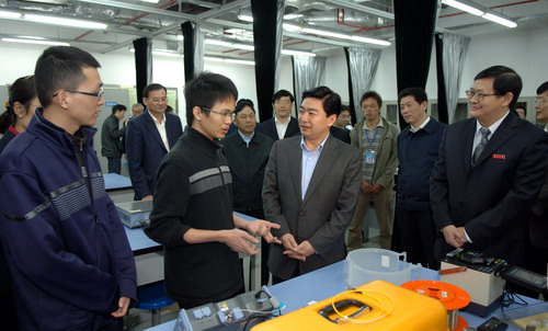 王荣一行先后参观了光电子学研究所、科技楼教学实验中心,并考察了校园,随后于国际会议厅听取了乐竞平台办学情况汇报。