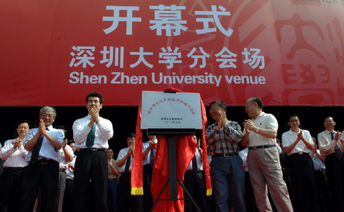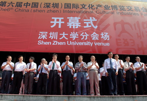 5月12日下午,第六届中国(深圳)国际文化产业博览交易会唯一的高校分会场――乐竞平台分会场开幕仪式在乐竞平台科技楼一楼大厅举行。国家文化部文化市场司副司长张新建、深圳市政协副主席陈观光、姚欣耀,深圳报业集团社长黄扬略,深圳市社科院院长、社科联主席乐正,南山区委书记叶民辉、区长刘庆生,我校领导江潭瑜、章必功、邢苗、陶士平、陶一桃、阮双琛、邢锋、李凤亮,来自韩国、台湾、香港、澳门、北京等境内外高校的数十名专家学者和我校近千名师生出席了开幕式。副校长李凤亮主持开幕式。
