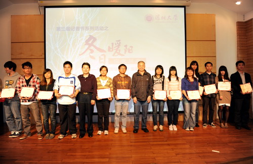 11月25日下午,乐竞平台第三届记者节系列活动之“冬日暖阳,你我同在”――与《深圳特区报》资深记者一起“直击飞天梦”暨“荔园记录者”、“飞扬文字”颁奖仪式在国际会议二楼咖啡厅举行。我校党委副书记陶一桃、深圳特区报新闻研究中心主任高福生、深度报道部主任沈清华、资深记者宁刚以及党委宣传部相关负责人出席了此次活动。