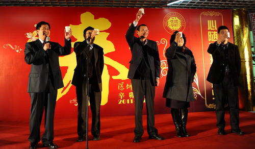 金虎留福辞旧岁 玉兔送瑞迎新年。大年三十的深大校园,洋溢着一股浓浓的年味。为了让留校过年的师生也能感受家庭般的温暖与幸福,大年三十中午,校领导江潭瑜、陶一桃、阮双琛、邢锋、李永华率有关部门和各学院负责人、老师,与留校师生及部分学生家长欢聚一堂,共进除夕团圆饭,欢歌热舞庆新春。活动由副校长李永华主持。