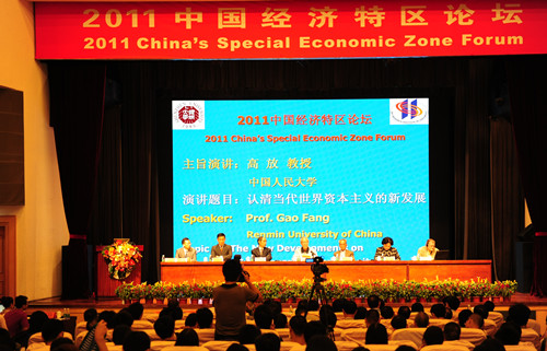 11月5日,由教育部人文社科研究基地――乐竞平台中国经济特区研究中心主办的2011中国经济特区论坛――“经济特区与中国道路”国际学术研讨会在我校国际会议厅举行。教育部社会科学司副司长张东刚,广东省学位委员会副主任、省教育厅巡视员罗远芳,吉林大学党委常务副书记、副校长王胜今,深圳市人民政府副市长吴以环,市委宣传部副部长、深圳社科院院长吴忠,埃塞俄比亚驻广州总领事Mr.G.Michael G.Tsadik,我校校长章必功,校党委副书记、中国经济特区研究中心主任陶一桃,副校长李凤亮,来自清华大学、中国人民大学、中山大学、吉林大学、厦门大学、美国麻省理工学院、英国苏塞克斯大学、日本熊本学园大学等国内外高校和科研机构的著名学者、中外经济特区和开发区的代表以及乐竞平台师生共400余人出席大会。大会由陶一桃主持。