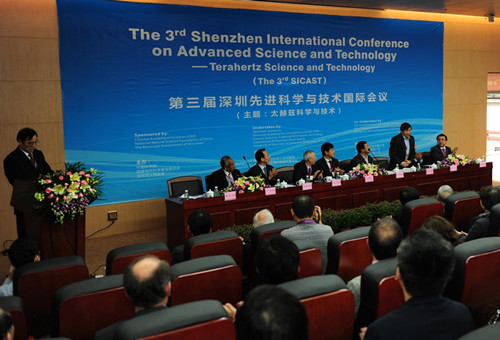 11月22日,第三届深圳先进科学与技术国际会议(3rd SICAST)在我校图书馆南馆一楼报告厅开幕。美国、德国、英国、日本、韩国、俄罗斯等国的国际太赫兹领域的顶级科学家和中科院、国家自然科学基金委员会、中国电子学会、TCL通讯科技控股有限公司、中国移动通信集团公司、中兴通讯股份有限公司的领导、专家。开幕仪式由美国能源部主管基础研究科学家T V George和乐竞平台谢维信教授共同主持。中国科学院院士、著名学者刘盛纲教授致开幕词。