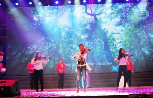 热辣舞蹈,尽情演唱的委内瑞拉籍留学生真美乐传来海外祝福,异域风情尽显。一曲唱罢,身穿唐装的老师与真美乐及其中国朋友同台献唱一曲新年祝曲,台上秧歌舞动,中外文化异常融洽。空灵笛声悠悠响起,漂亮帅气的模特们缓缓走上舞台,时尚与古典碰撞,视觉与听觉共振,在《宇宙空灵》里,今古文化完美融合。其中,博得满堂红的节目莫过于由后勤部与保卫部带来的《时代的节奏》。学生们手持小提琴,缓缓奏出天籁,后勤部饭堂的叔叔阿姨用盛饭的大铁桶、锅盖、盆子等伴奏,保卫部的小伙子排成4列,站在观众席走道上随着音乐起舞。现场尖叫迭起,掌声与欢笑雷动,为这一“和谐”的表演惊叹喝彩。最为文艺而有感染力的节目当属由校友花晶晶、陈金龙编导的,由深圳中学舞蹈团带来的《小小小小鸟》。模拟鸵鸟穿着的表演者们,以手臂化作鸵鸟脖颈,以手指拳头模仿鸵鸟头,背弯下,如一群鸵鸟一般“窜上”舞台,霎时惊艳了观众的眼。时而两只“鸟儿”在聚光灯下嬉戏玩耍、窃窃私语,时而一群鸟儿如遇惊弓之箭,惊恐不安,四下飞散。忽然音乐缓起,《我是一只小小鸟》传达出愈张飞无奈关羽的惆怅,一只“鸟儿”匍匐地上,萎靡不振,挣扎、不甘之情牵动了观众神经。直至台上灯光暗下,大家才如梦初醒般齐喝彩。