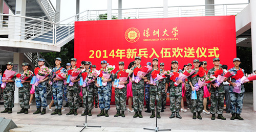 9月4日下午,我校2014年新兵入伍欢送仪式在学生活动中心举行。校党委副书记张基宏、副校长李凤亮,南山区武装部部长黄辉,校武装部及各学院负责人、入伍新兵和学生代表参加了欢送仪式。