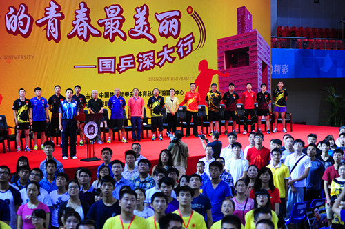 最后的乒乓球表演环节,深大副校长黎军,网络报名抽签的乒乓球爱好者与刘国梁、王楠及其他国家队队员进行趣味比赛,国家乒乓球队主力队员们也在现场为师生“秀”了一把球技,现场气氛热烈。