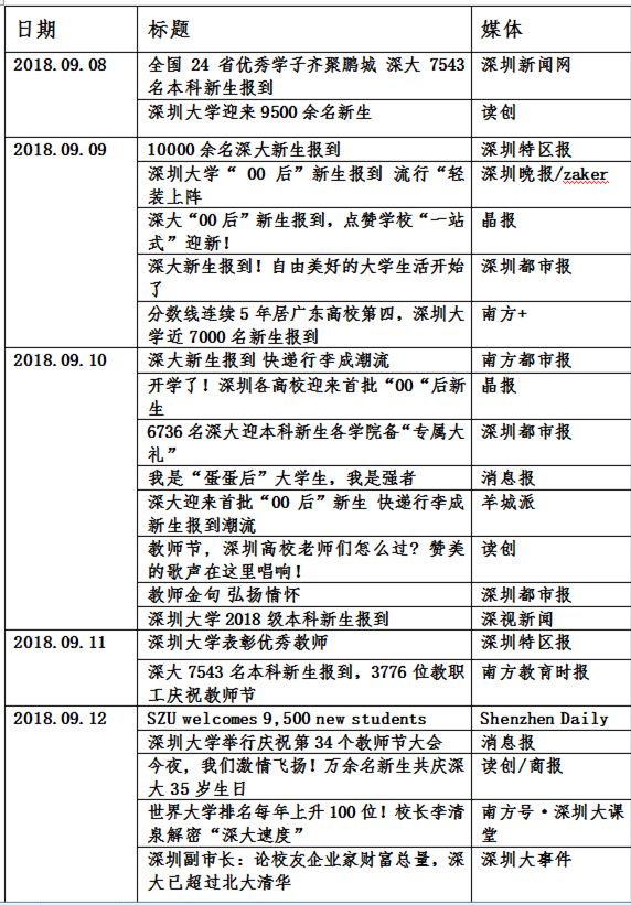 光明网、《南方日报》、《深圳特区报》/读特、深圳卫视、《南方都市报》、深圳新闻网、深圳交通广播、《晶报》、《深圳晚报》/zaker、《深圳商报》/读创、《深圳都市报》……从纸媒到网络媒体,从电视节目到广播节目,对我校一系列活动开展了紧锣密鼓的报道。