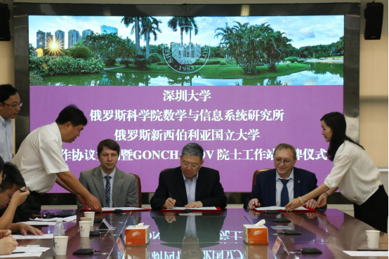 5月24日上午,我校与俄罗斯院科学院西伯利亚分院Sobolev数学研究所、 A. P. Ershov信息系统研究所以及俄罗斯新西伯利亚国立大学在办公楼201会议室签署合作协议,同时举行俄罗斯科学院Sergei Goncharov院士工作站揭牌仪式。我校校长李清泉,副校长徐晨,俄罗斯新西伯利亚国立大学校长Mikhail Fedoruk,俄罗斯科学院院士、俄罗斯科学院西伯利亚分院Sobolev数学研究所所长Sergei Gancharov,俄罗斯科学院院士、俄罗斯科学院西伯利亚分院A. P. Ershov信息系统研究所所长Andrew Palyanov、首席科学家Victor Selivanov,俄罗斯喀山联邦大学统计与计算数学系主任Farid Ablaev出席会议。我校计算机与软件学院特聘教授、大数据技术与应用研究所所长黄哲学主持会议。