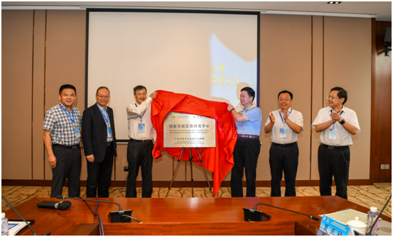 之后,由最高院所第一巡回法庭郭修江副庭长、广东省法学会姜滨副会长、中国政法大学时建中副校长、广东财经大学杜承铭副校长、乐竞平台徐晨副校长、中国人民大学法学院王轶院长共同上台为“创新发展法治研究中心”揭牌。