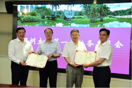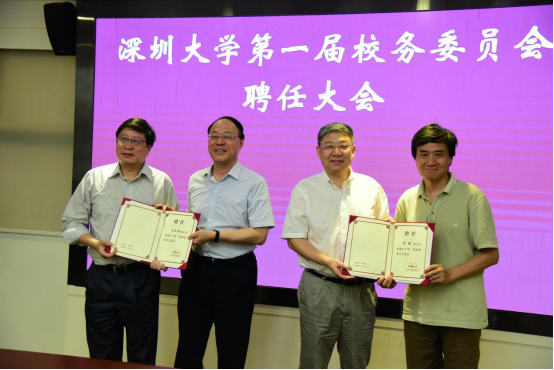 刘洪一、李清泉共同为校务委员会成员颁发聘任证书并合影留念。