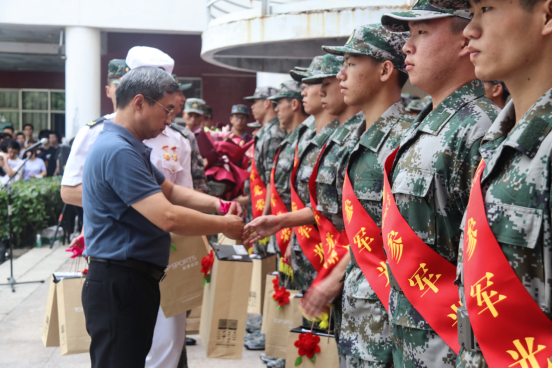 王晖校长嘱托学生,要脚踏实地,自强不息,立足岗位发光发热,铸造辉煌军旅人生。随后,王校长和朱政委与新兵亲切握手,并赠送纪念品和鲜花。仪式最后,乐队奏响中国人民解放军军歌,出席领导与新兵合影留念。