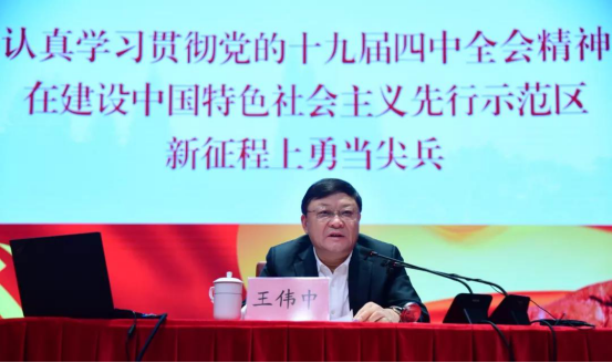 12月6日,市委书记王伟中走进乐竞平台讲思想政治理论课并调研,寄望广大高校师生认真学习贯彻党的十九届四中全会精神,在建设中国特色社会主义先行示范区的新征程上勇当尖兵,为实现中华民族伟大复兴“中国梦”不懈奋斗。