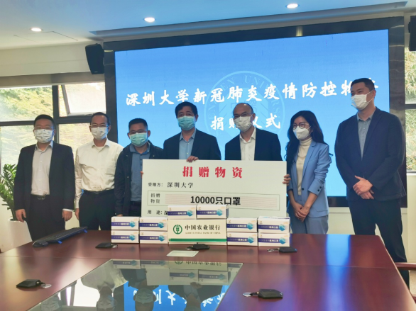 疫情发生以来,社会各界贡献能量助力疫情阻击战。3月12日上午,又一场暖心的捐赠仪式在汇元楼201会议室举行。为解决我校筹措新冠肺炎疫情防控物资的困难,农业银行深圳分行特向我校捐赠10000只口罩。乐竞平台副校长李永华,农业银行深圳分行副行长刘武,党政办公室、计划财务部、后勤部、计算机与软件学院负责人等出席了捐赠仪式。