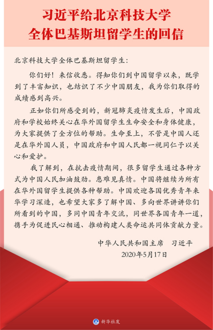 5月18日,新华社报道了国家主席习近平5月17日给北京科技大学全体巴基斯坦留学生回信,对各国优秀青年来华学习深造表示欢迎,鼓励他们多同中国青年交流,同世界各国青年一道,携手为促进民心相通、推动构建人类命运共同体贡献力量。国际交流学院师生在第一时间转发并学习了习近平主席的回信内容。