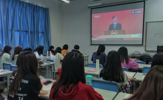广大师生认真观看大会直播,仔细聆听习近平总书记重要讲话,全神贯注、边听边记,深切感受大会热烈氛围,深入领会总书记重要讲话的核心要义与精神实质。习近平总书记的重要讲话在广大师生中引发强烈反响,大家深受鼓舞、倍感振奋,为深圳经济特区建立40年来所取得的伟大成就感到骄傲。