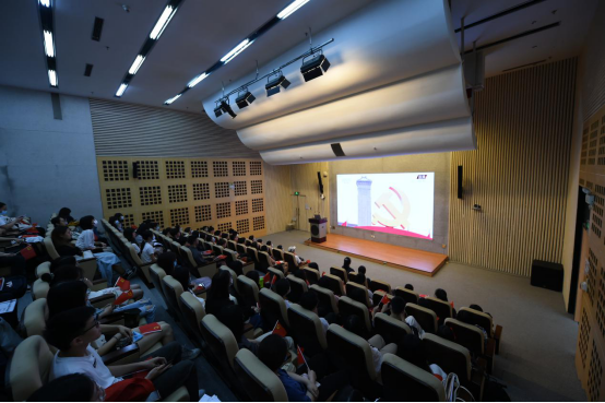 上午8时,庆祝大会隆重举行!在主会场和分会场,党员干部、师生代表佩戴党徽,满怀激情收看实况直播。