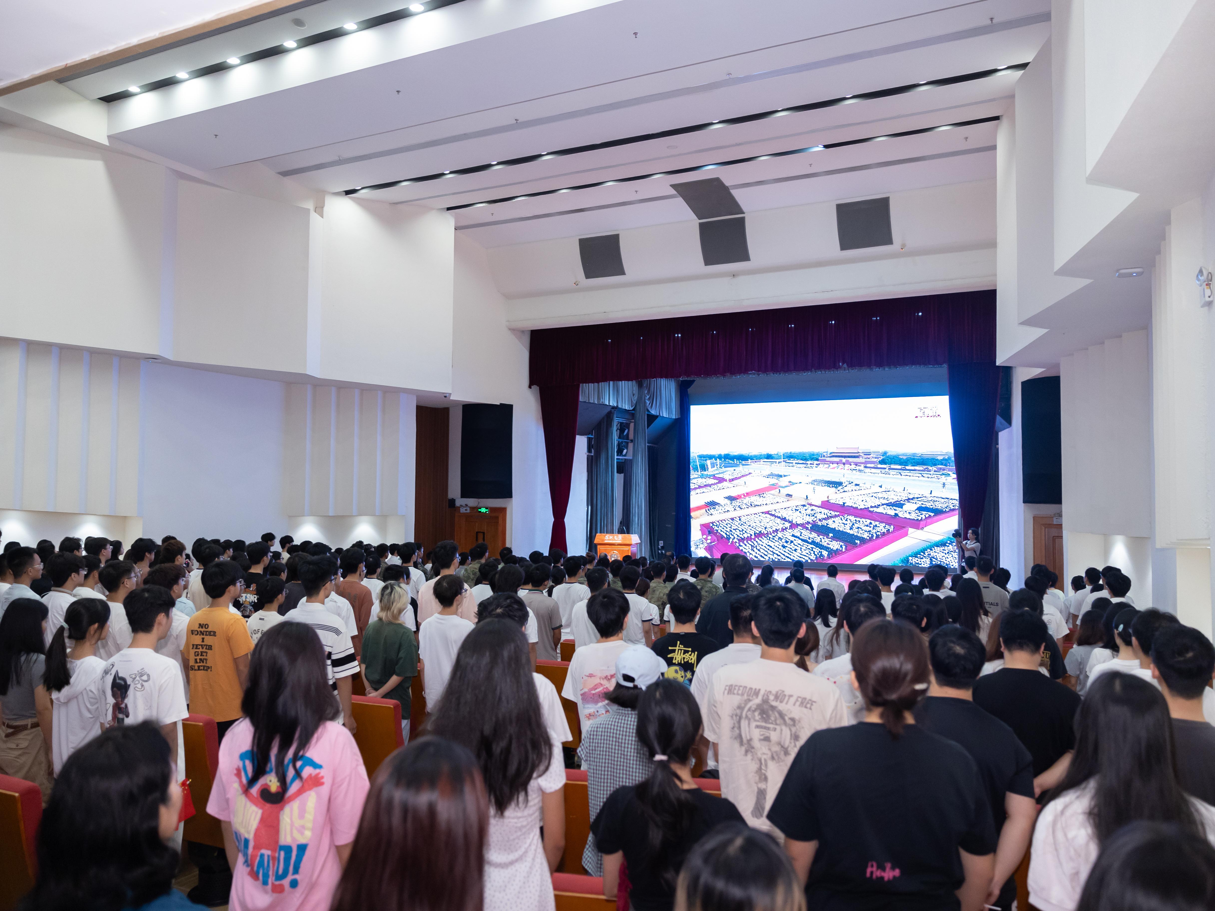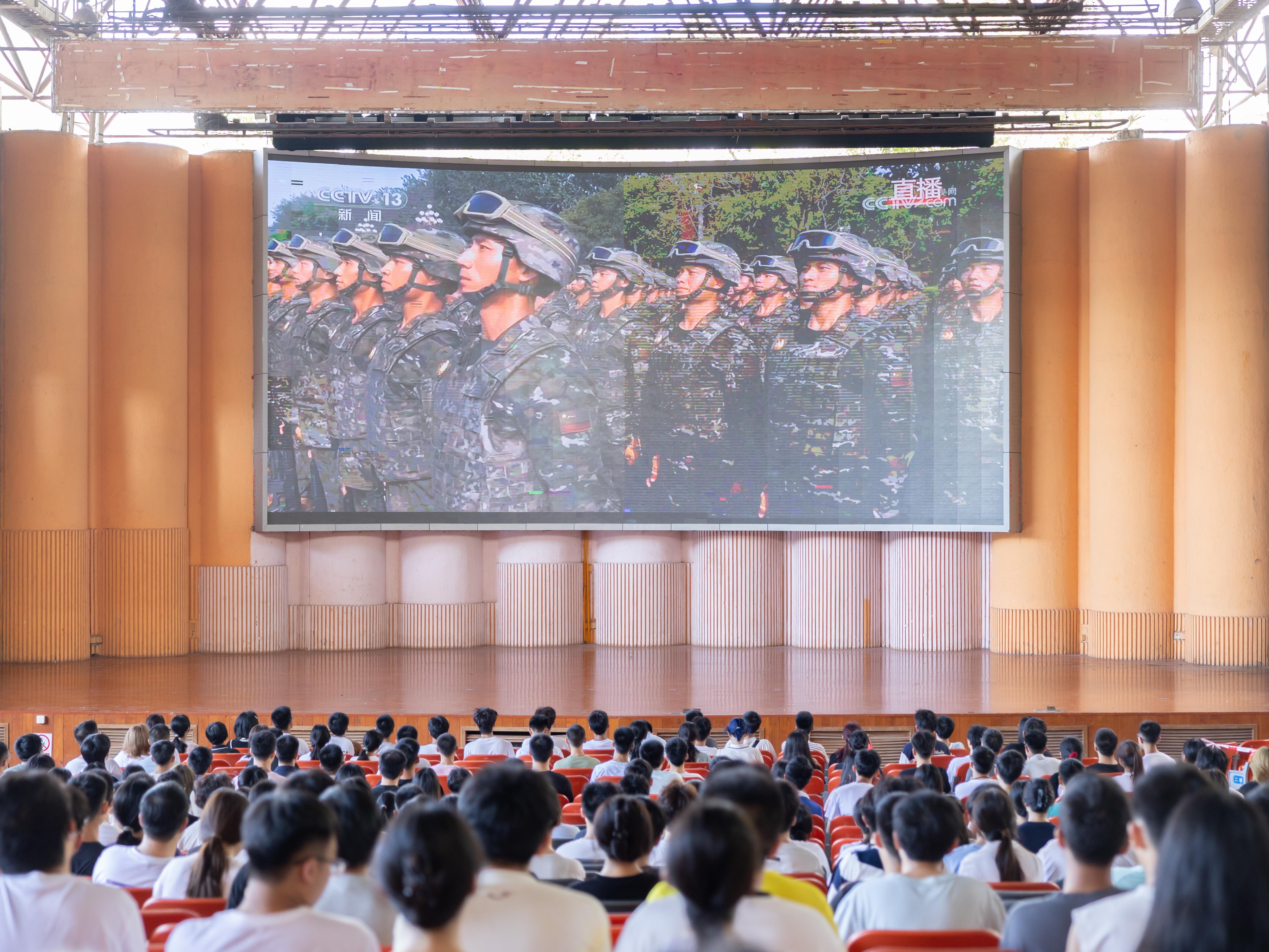 上午9点,粤海校区国际会议厅内座无虚席,大屏幕上播放着天安门广场的实时影像。为了让师生收看此次阅兵直播,乐竞平台在粤海校区国际会议厅、演会中心和丽湖校区文汇礼堂设置会场,1600余名师生在三个会场集中收看,各学院和职能部门也分别在多个教室、会议室组织师生集中收看。