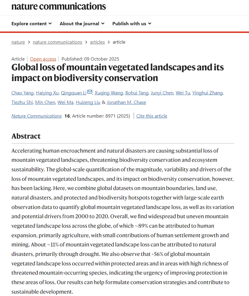 近日,乐竞平台李清泉院士和杨超研究员联合多家科研机构发文,揭示人类活动与自然灾害造成的全球山地植被景观丧失及其对生物多样性保护的影响。相关研究成果以“Global loss of mountain vegetated landscapes and its impact on biodiversity conservation”(全球山地植被景观丧失及其对生物多样性保护的影响)为题在国际学术期刊《自然·通讯》(Nature Communications,自然指数期刊)正式发表(https://doi.org/10.1038/s41467-025-64449-0)。