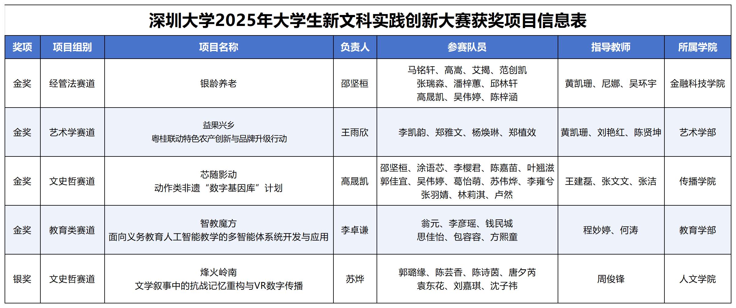 本次参赛成绩展现了师生团队勇于创新、敢于实践的精神风貌,祝贺获奖团队及指导教师。期待SZUer再接再厉,持续深化新文科教育教学改革,推动学科交叉融合与创新能力提升,在未来各项赛事与育人实践中再创佳绩!
