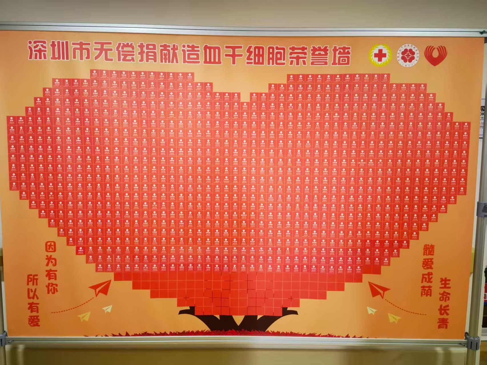龙子鸣的病房外有两面“爱心墙”——一面写着龙子鸣作为“生命接力者”的记录“造血干细胞捐献全国第21658例 深圳第945例”,另一面则是深圳市无偿捐献造血干细胞荣誉墙,上面是深圳从2001年至今所有的无偿捐献者的名字组成的巨大红色爱心。