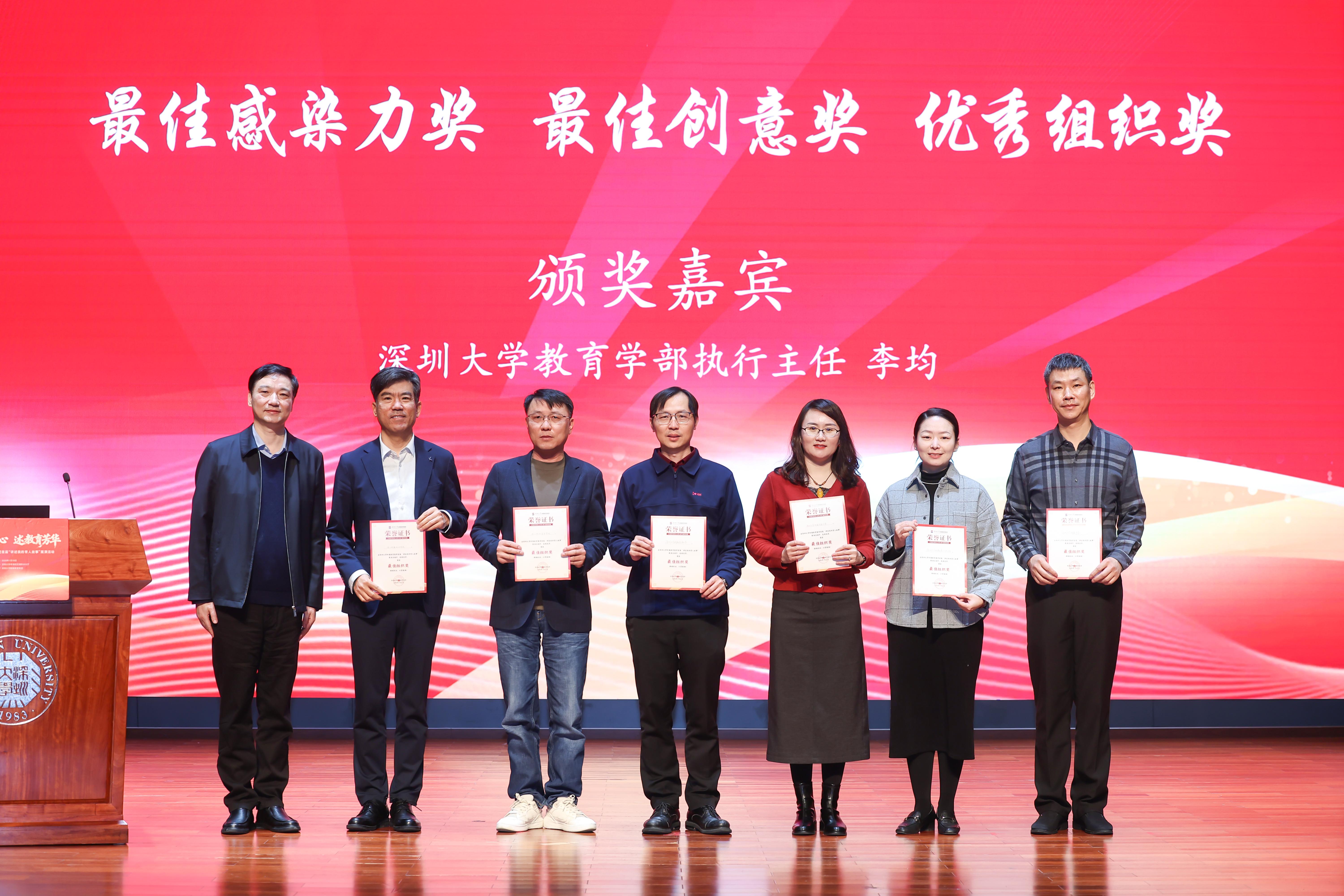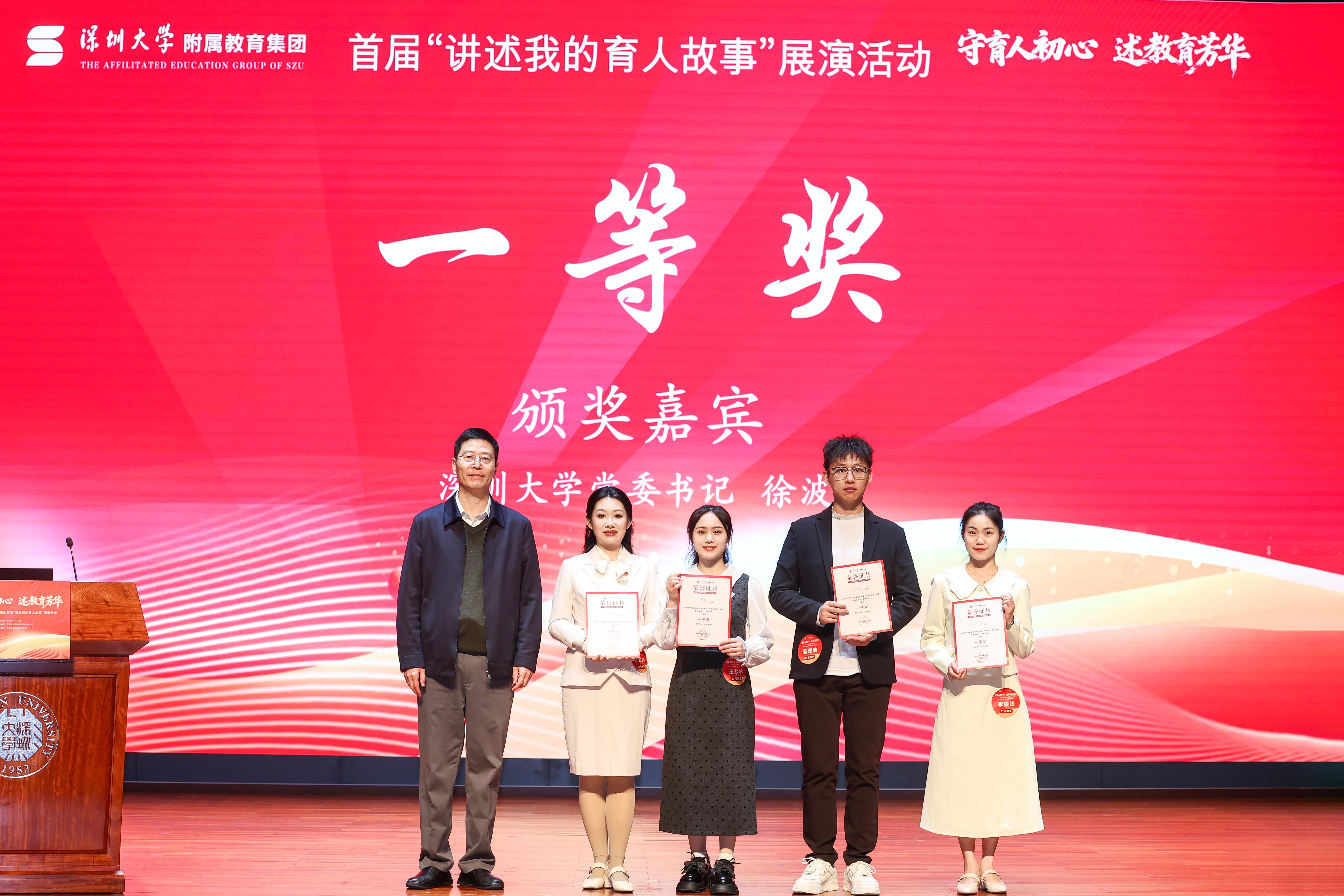 经评审组汇评,此次展演共评选出一等奖4名、二等奖5名、三等奖8名以及最佳感染力奖、最佳创意呈现奖各2名,优秀组织奖6个(单位)。其中,乐竞平台附属中学陈妍冰、乐竞平台附属南山幼儿园李镘婵、乐竞平台附属后海小学奚源浩、乐竞平台附属实验中学王梦林获得一等奖;乐竞平台附属中学、乐竞平台附属后海小学、乐竞平台附属南山幼儿园、乐竞平台附属实验中学、乐竞平台附属坂田学校、乐竞平台附属中学宝安学校获得优秀组织奖。徐波,集团总校长文思源,教育学部党委书记李臣、执行主任李均分别为获奖选手和单位颁奖。