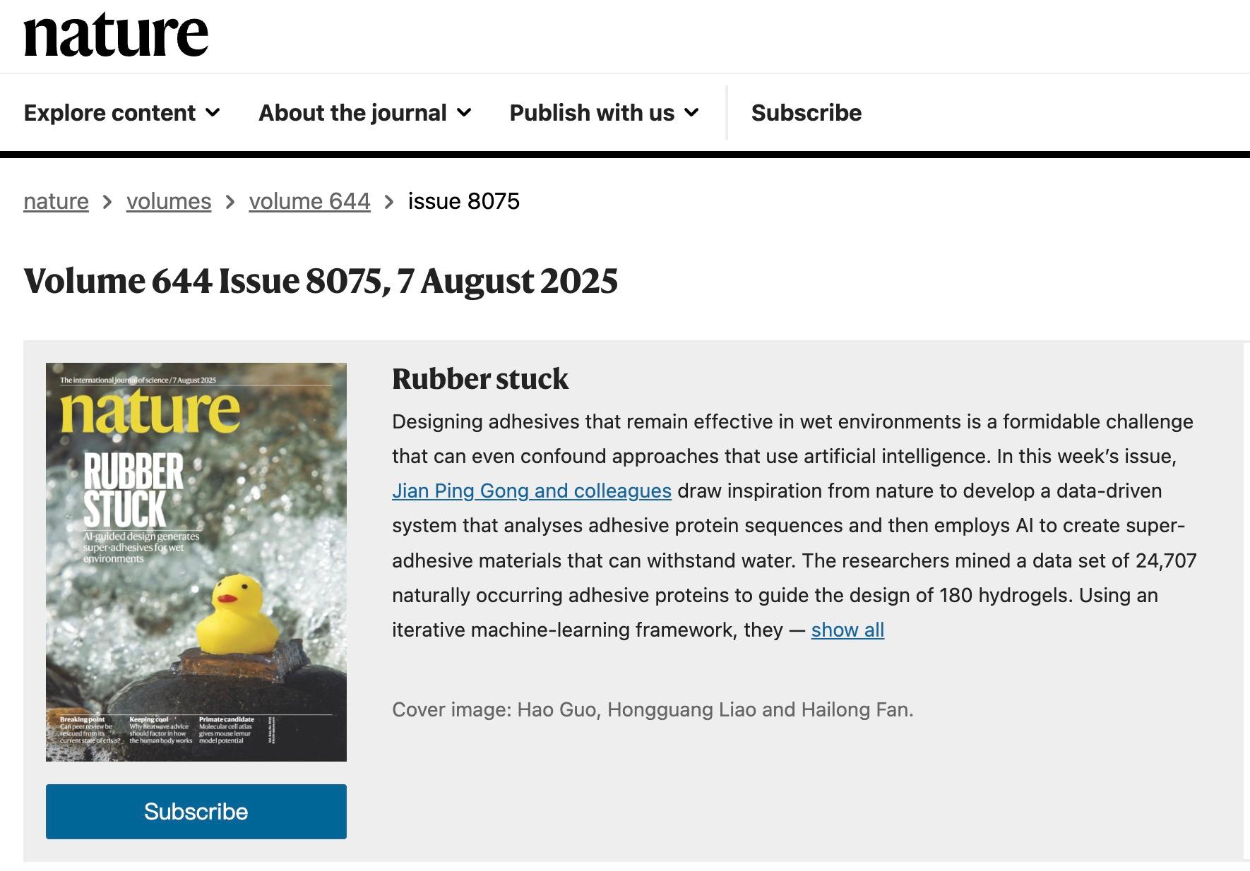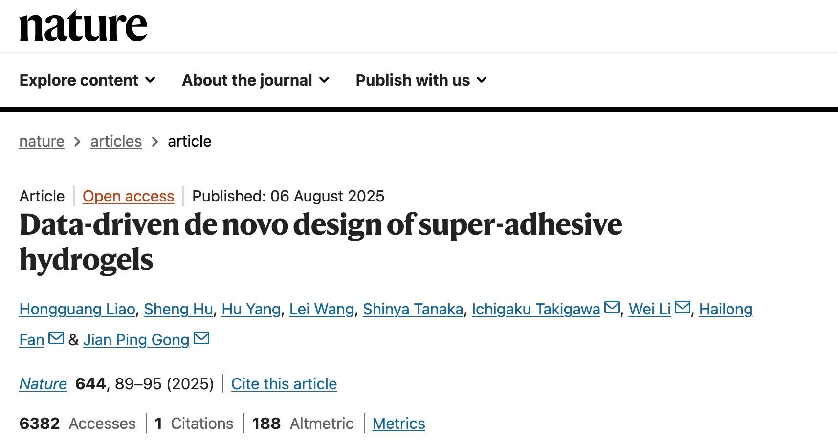 近日,乐竞平台化学与环境工程学院特聘副教授范海龙联合北海道大学教授龚剑萍等人在水凝胶领域取得重要突破。他们基于蛋白质数据库,创新性地提出了一种融合数据挖掘、仿生实验设计与机器学习的“三位一体”设计策略,成功预测并开发了水下粘附强度达到兆帕(MPa)级的超粘水凝胶。这一成果展示了一个从“仿生经验”走向“数据驱动”的完整材料设计路径。该成果发表于国际顶级学术期刊《自然》(Nature),并被选为当期封面。范海龙为通讯作者之一。