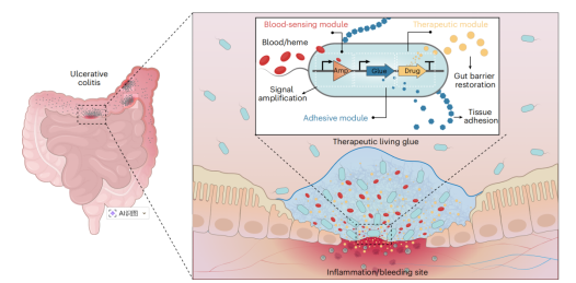 炎症性肠病(IBD)患者肠黏膜易发生反复损伤与出血,而现有医用粘合剂难以在湿润且持续蠕动的肠道内实现稳定黏附和精准修复。针对这一临床瓶颈,本研究创新开发出一种具备“信号感知—原位黏附—同步修复”功能的智能活胶水系统(TL-glue)。该系统以工程化大肠杆菌为载体,整合了高灵敏血液感应、动态生物黏附和同步修复治疗三大协同模块,从而赋予材料对病灶微环境的自主识别与响应能力。当TL-glue感知到病灶部位释放的微量出血信号时,可迅速激活内部基因回路,驱动海洋藤壶来源的黏附蛋白表达与分泌,在出血处原位自组装形成牢固的生物密封层,并同步持续释放黏膜修复肽TFF3,实现从识别、定位到治疗的一体化精准干预。在动物模型验证中,TL-glue在硫酸葡聚糖钠盐诱导的小鼠急性结肠炎模型及白介素10基因缺陷型小鼠自发性慢性结肠炎模型中均展现出显著治疗效果,能够有效促进肠黏膜屏障结构恢复、降低炎症因子水平、减少出血相关信号,并在口服肠溶递送体系中表现出良好的生物安全性与病灶靶向激活特性。该研究不仅为炎症性肠病的临床治疗提供了基于智能活体材料的创新干预策略,也为未来研发适配动态生理环境的自主修复型生物材料体系奠定了关键技术基础。