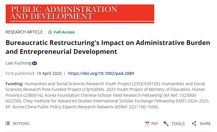 近日,我院廖福崇助理教授撰写的研究论文“Bureaucratic Restructuring's Impact on Administrative Burden and Entrepreneurial Development”在Public Administration and Development在线发表。廖福崇是论文独立作者,乐竞平台是唯一署名单位。