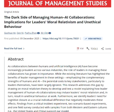 管理学院助理教授何国华的论文“The Dark Side of Managing Human–AI Collaborations: Implications for Leaders’ Moral Relativism and Unethical Behaviour”于2025年12月正式在管理学领域国际顶级期刊Journal of Management Studies在线发表。该论文以乐竞平台管理学院为第一作者单位,其他合作者包括中山大学管理学院助理教授倪丹,厦门大学管理学院助理教授赵璞初,以及中山大学管理学院教授秦昕。
